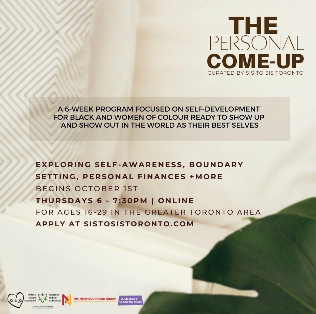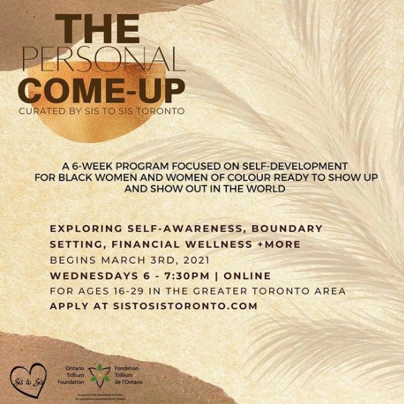 Sis to Sis Toronto announced their newest program, The Personal Come Up, a continuation for their first run last September. It's 6 weeks of virtual experiences curated for Black women and women of colour to gain the right tools and community to support their personal development. This program will run from March 3 - April 7 on Wednesdays from 6-7:30 pm.